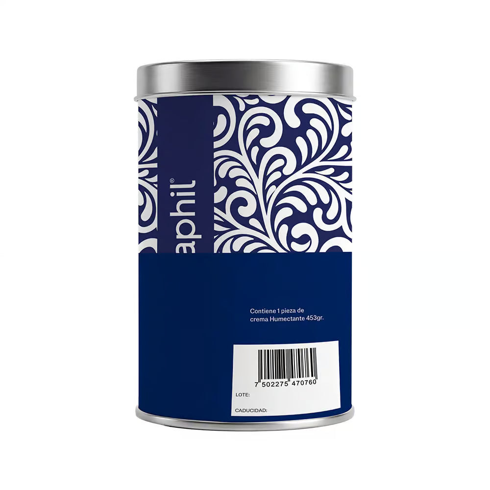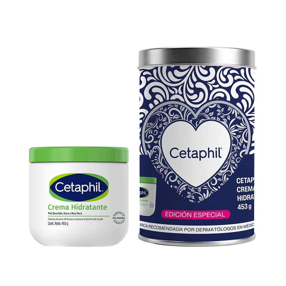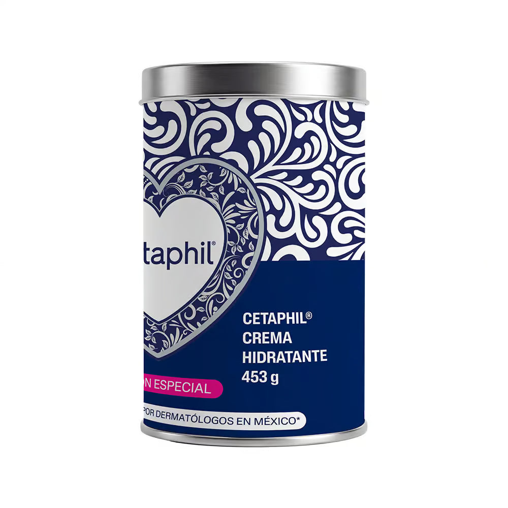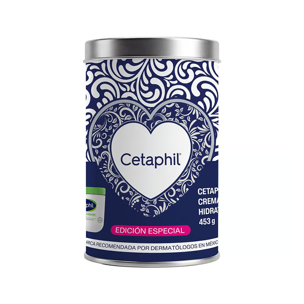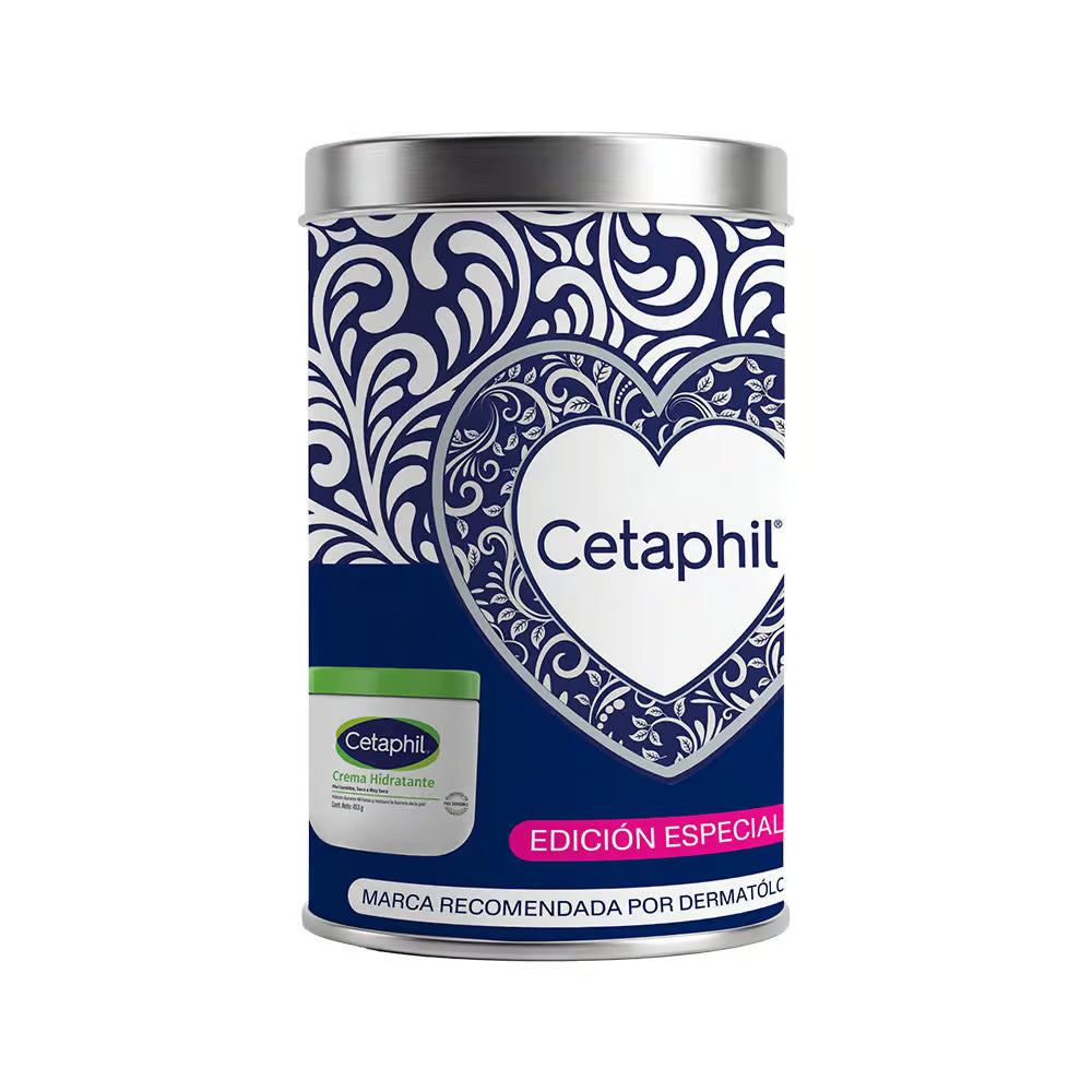 Edición especial ideal para regalo que incluye la crema hidratante clásica de Cetaphil en presentación de 453g junto con una lata decorativa. Hidrata profundamente y protege la piel, siendo apta para todo tipo de piel, incluso sensible.