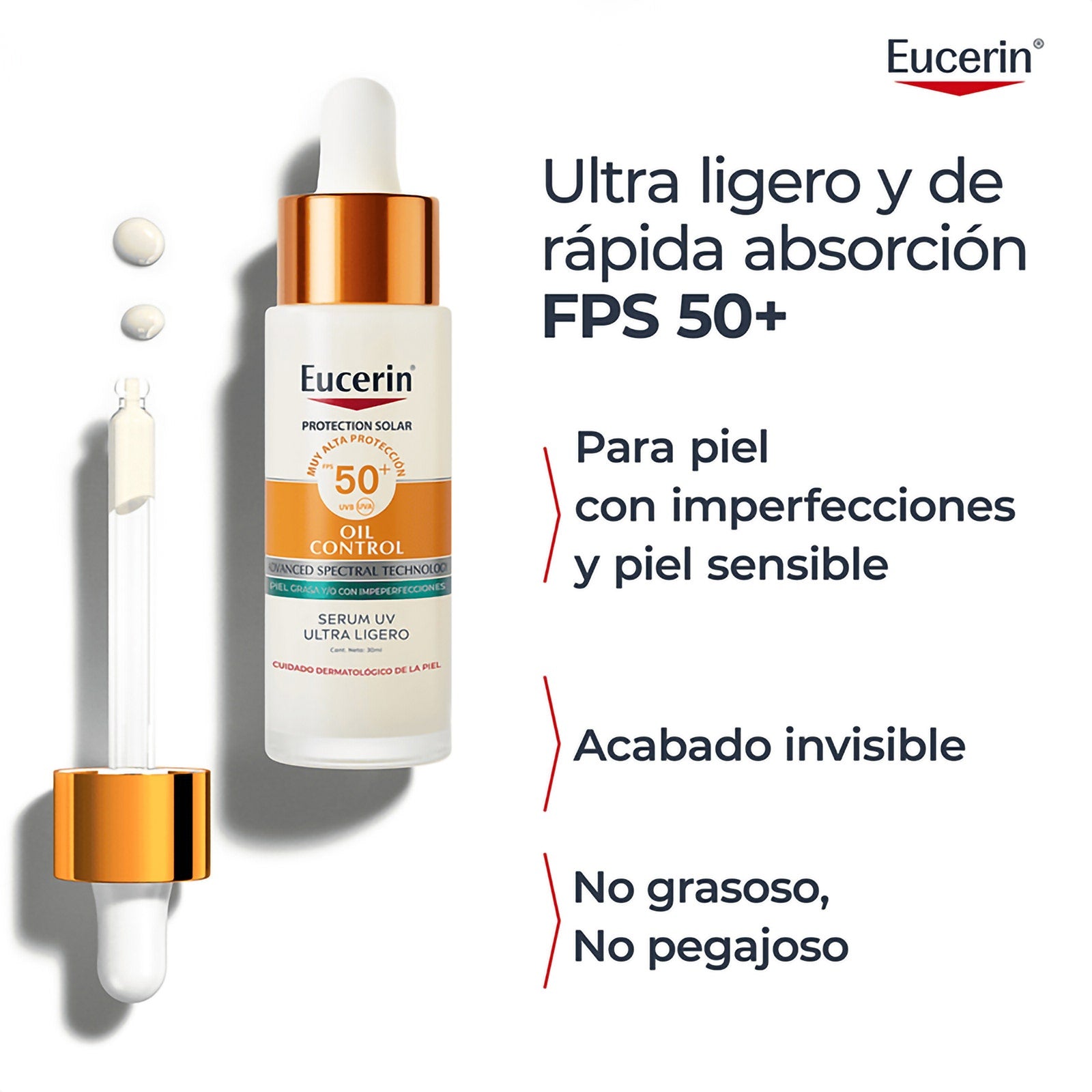 Protector solar facial en formato sérum ultraligero ideal para piel grasa o con tendencia acneica. Ofrece muy alta protección SPF50+ contra rayos UVA y UVB mientras ayuda a controlar el brillo y mantener un acabado mate durante el día.