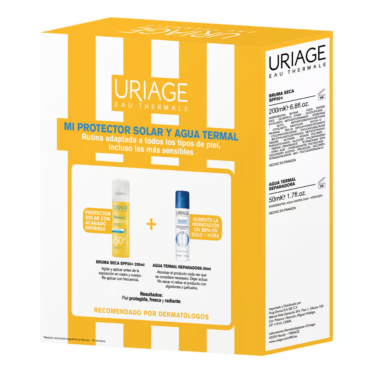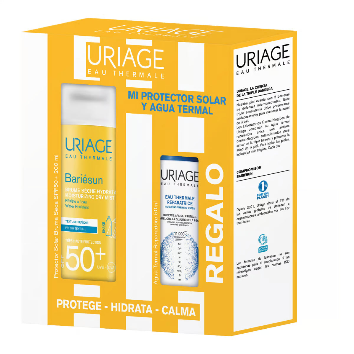 Kit de protección solar que combina una bruma seca SPF50+ de alta protección con agua termal de Uriage para refrescar, hidratar y calmar la piel. Ideal para proteger la piel de los rayos solares mientras mantiene una sensación de frescura y confort.