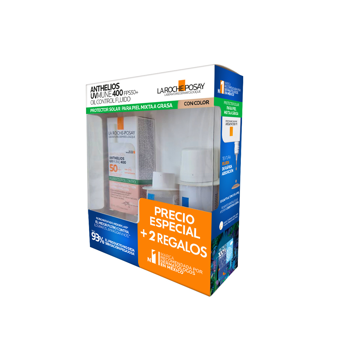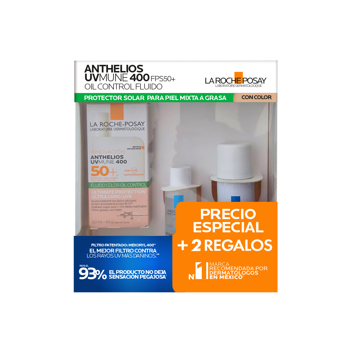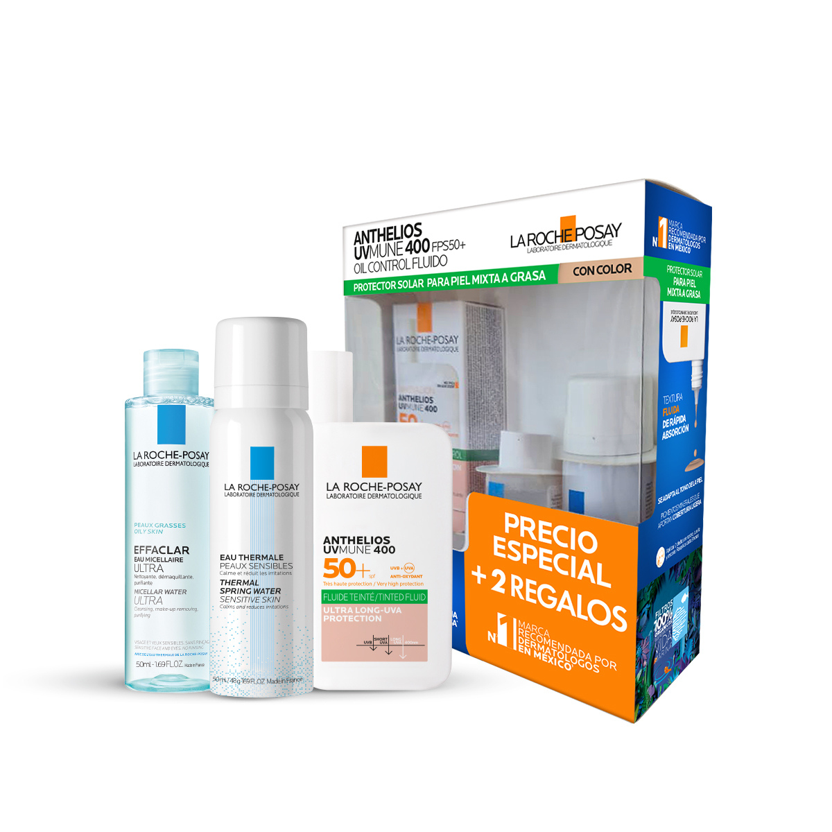 La Roche-Posay Kit Anthelios UVMune 400 Oil Control Fluido Con Color 50ml. + Agua Termal Prebiótica 50ml. + Agua Micelar 50ml.