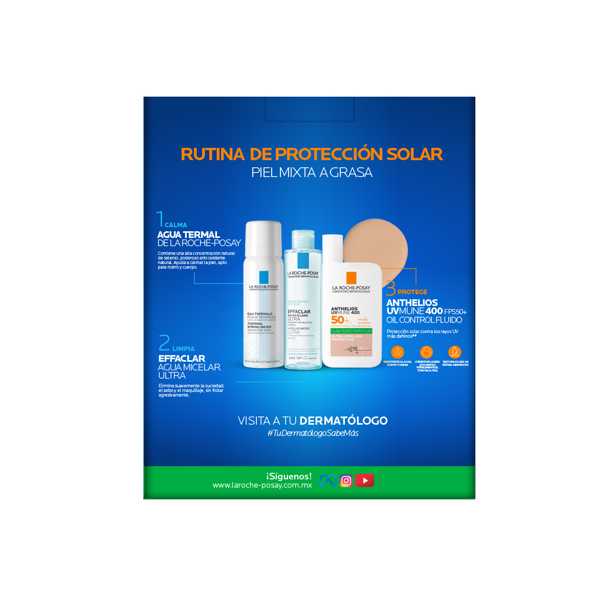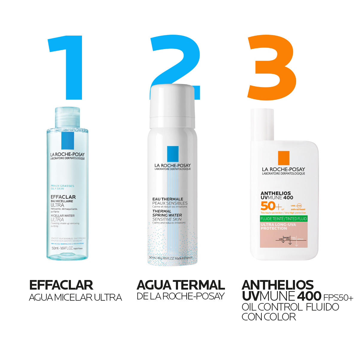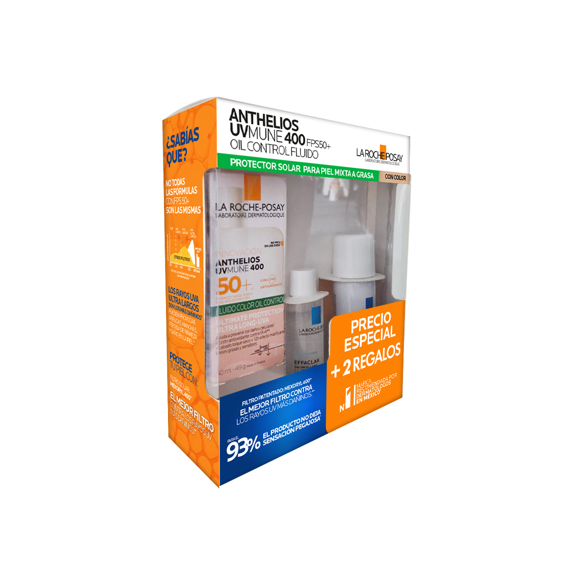 La Roche-Posay Kit Anthelios UVMune 400 Oil Control Fluido Con Color 50ml. + Agua Termal Prebiótica 50ml. + Agua Micelar 50ml.